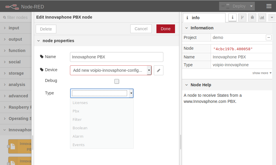 Hilfstexte und Beschreibungen finden sich in Node-RED im Info Tab, wenn die entsprechende Node selektiert ist.