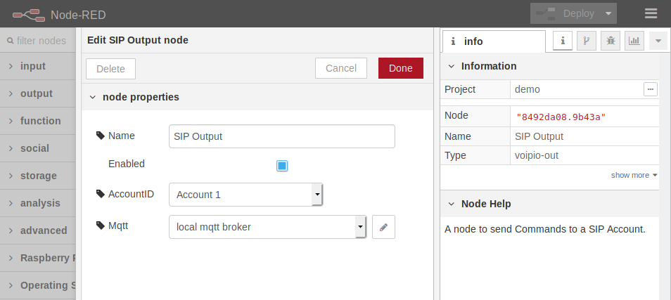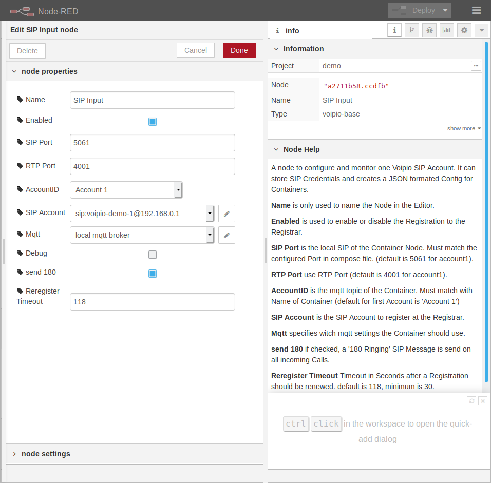 Die SIP Input Node stellt über MQTT die Verbindung zu einem ebenfalls über MQTT angebundenen SIP Container dar.