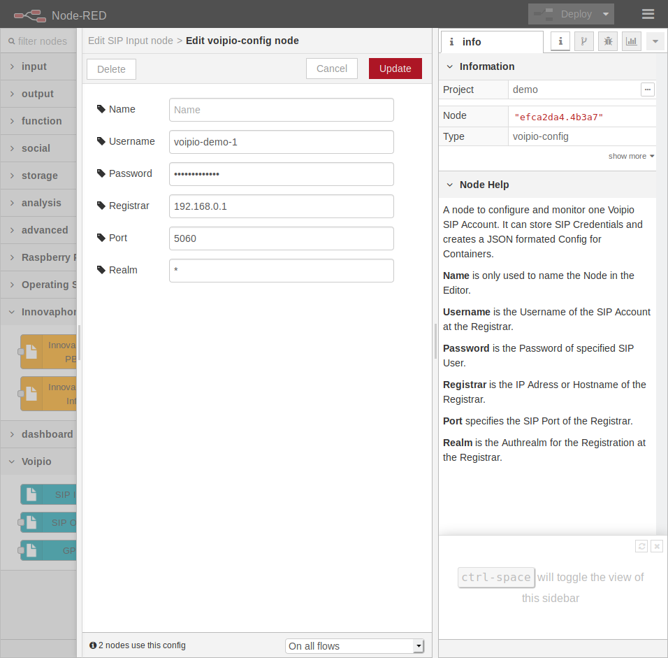 Mit der Node werden die SIP Zugangsdaten konfiguriert und an den Container geschickt.
